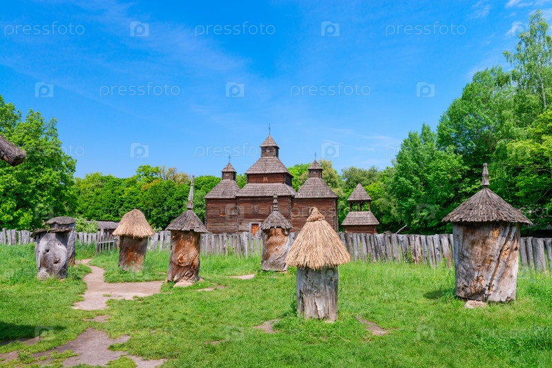 Древняя пасека с деревянными пчелиными ульями
