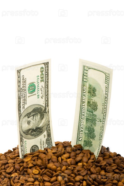 Две стодолларовые купюры торчат из кофейных зерен. Изоляция на белом фоне