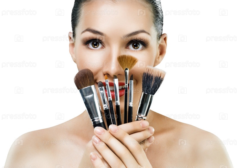 Красивая девушка с аксессуарами для нанесения макияжа