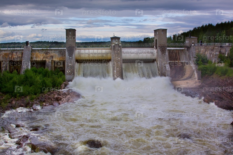 Спуск воды через плотину гидроэлектростанции в Иматре, Финляндия