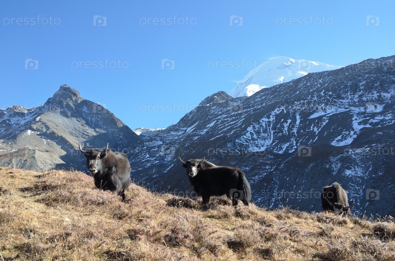 Непал, яки на фоне горного пейзажа