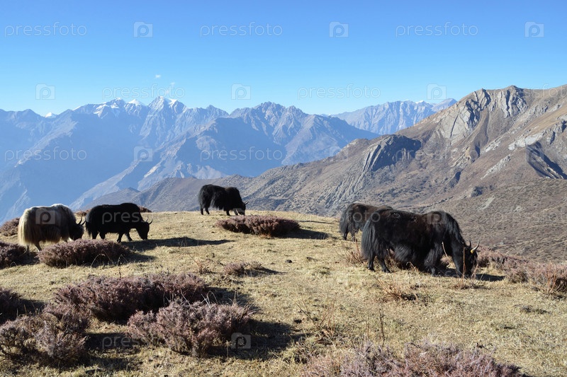 Непал, яки пасутся на фоне Гималайских гор