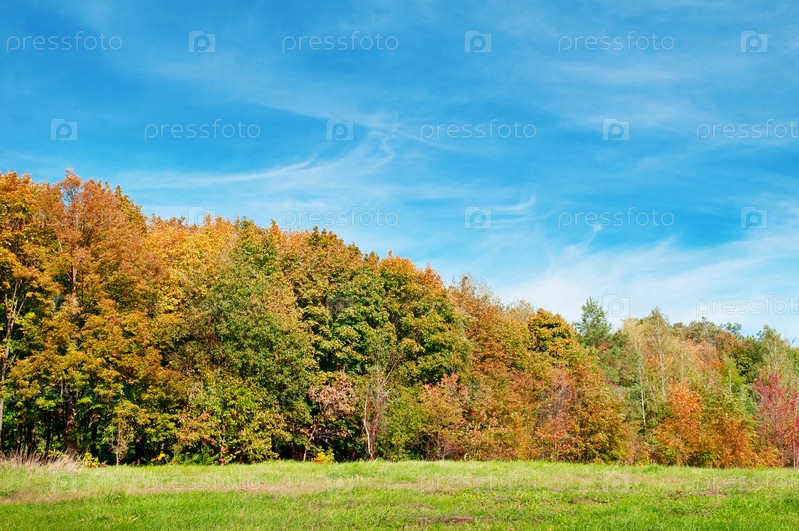 Осенний лес, зеленый луг и голубое небо