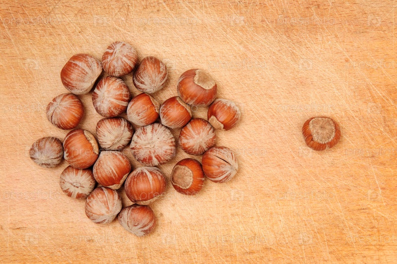 Кучка фундука, лежащего на столе и отдельный орешек справа
