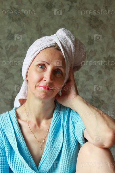 Женщина в голубом халате с завязанным на голове полотенцем
