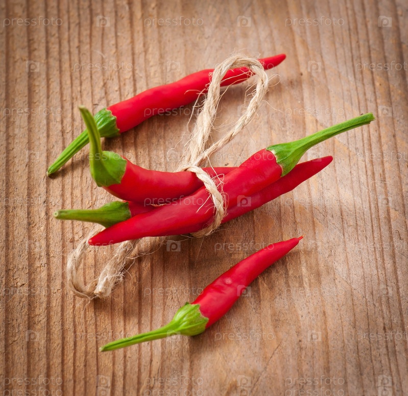 Красный острый перец, связанный веревкой, на деревянных фоне