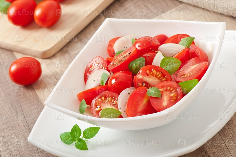 Салат из помидоров черри с базиликом, черным перцем и луком