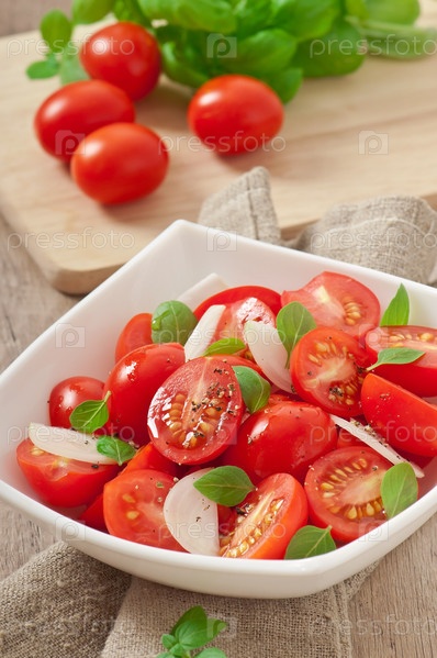 Салат из помидоров черри с базиликом, черным перцем и луком