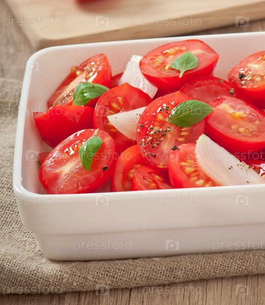 Салат из помидоров черри с базиликом, черным перцем и луком