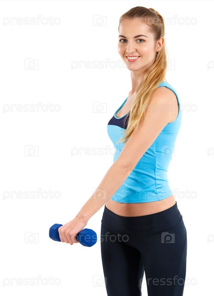Спортивная женщина с синей гантелью