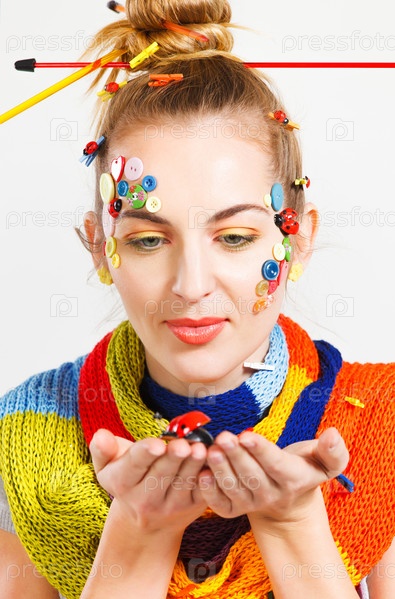Блондинка с творческой прической, цветными пуговицами и модным макияжем