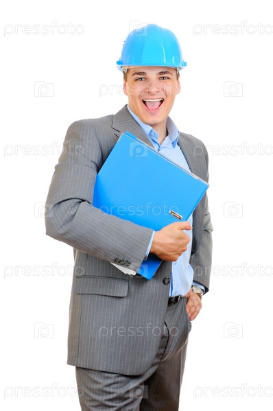 Радостный бизнесмен в каске и с папкой в руке