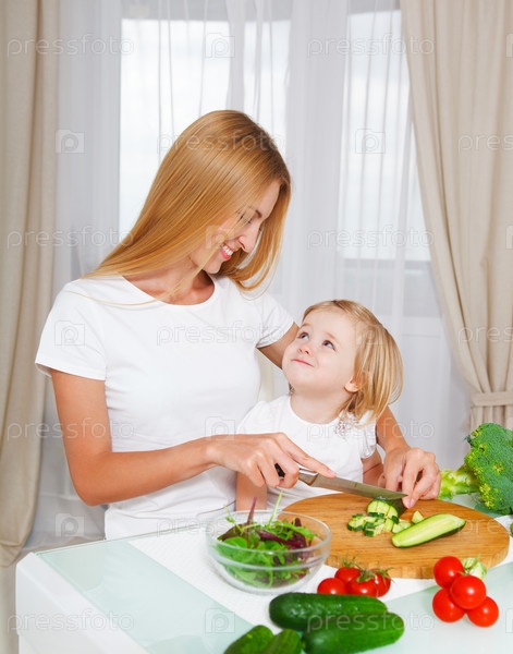 Счастливая мать и дочь на кухне