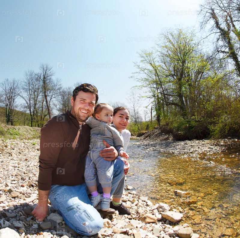 Счастливая молодая семья с маленькой дочерью у горной реки