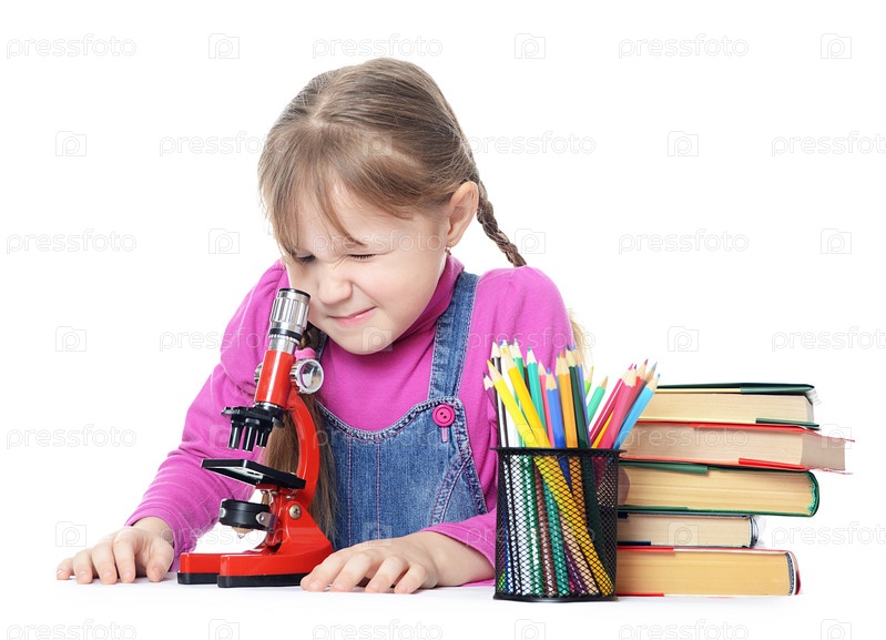 Девочка учит урок, изолированная на белом фоне