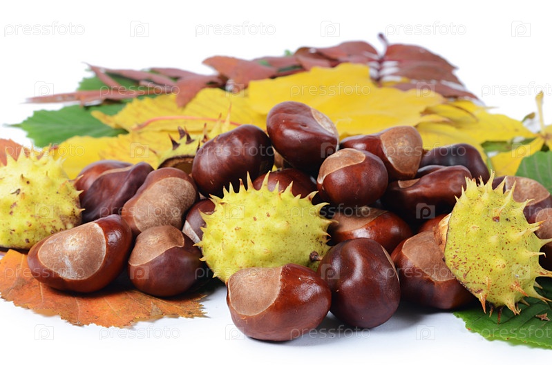 Каштаны на осенних листьях, изолированные на белом фоне