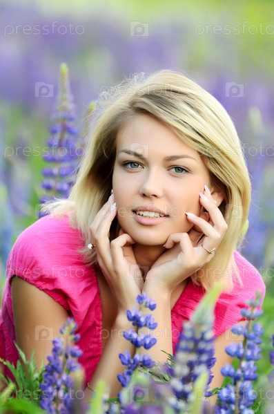 Красивая женщина на поле с люпинами