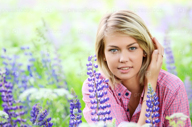 Красивая женщина в поле с люпинами