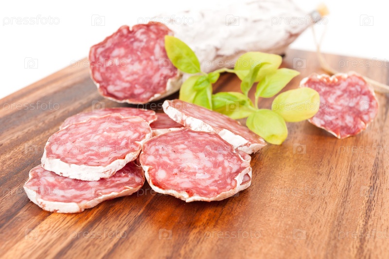Ломтики салями на белом фоне