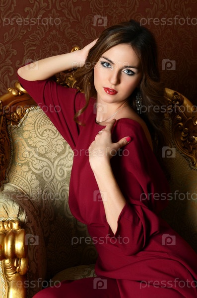 Элегантная чувственная молодая женщина в бордовом платье