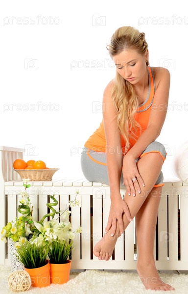 Женщина в спортивном костюме, касается своих ног