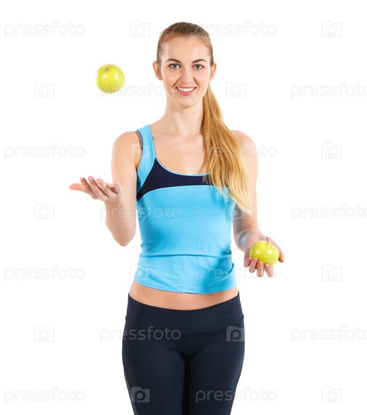 Счастливая спортивная женщина держит зеленое яблоко