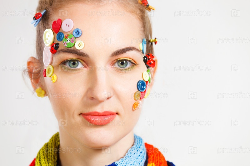 Блондинка с творческой прической с цветными пуговицами и модным макияжем
