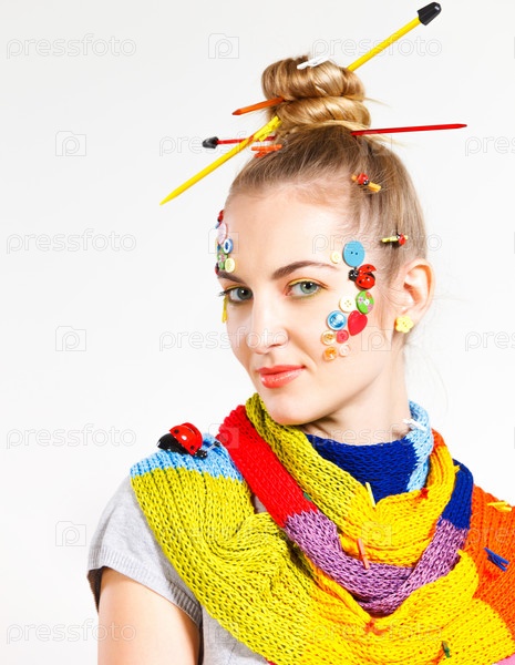 Блондинка с творческой прической с цветными пуговицами и модным макияжем