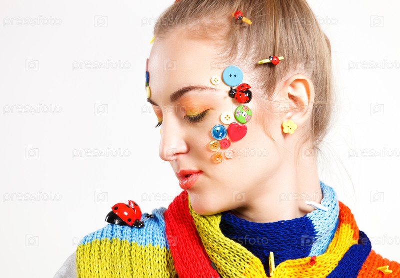 Блондинка с творческой прической с цветными пуговицами и модным макияжем