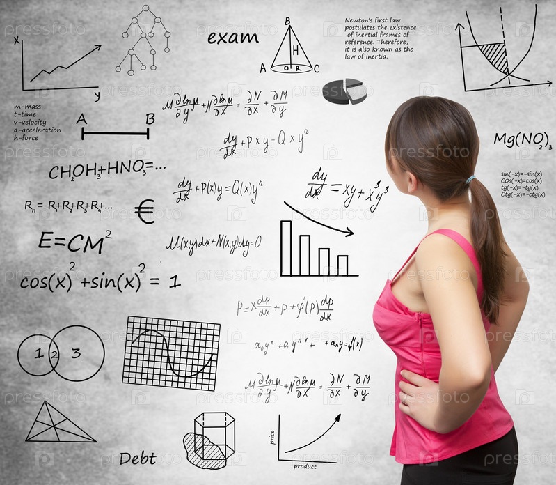 Девушка на фоне доски с формулами