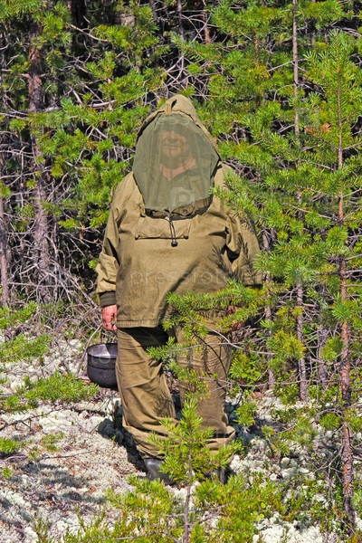 Пожилая женщина в куртке с накомарником в карельской тайге