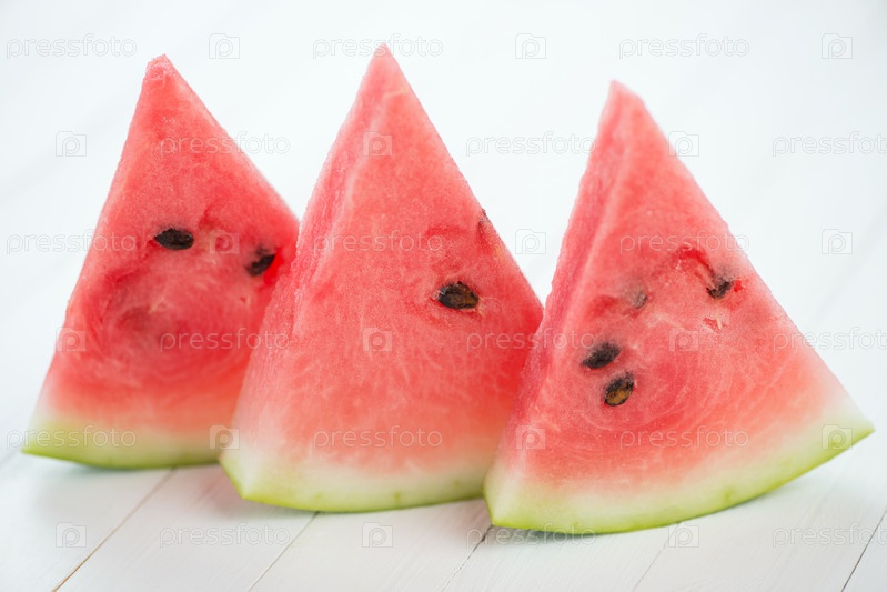 Ломтики спелого арбуза на белых деревянных досках, студия