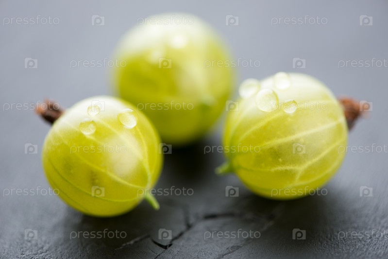 Зеленый крыжовник, покрытый каплями воды, макро