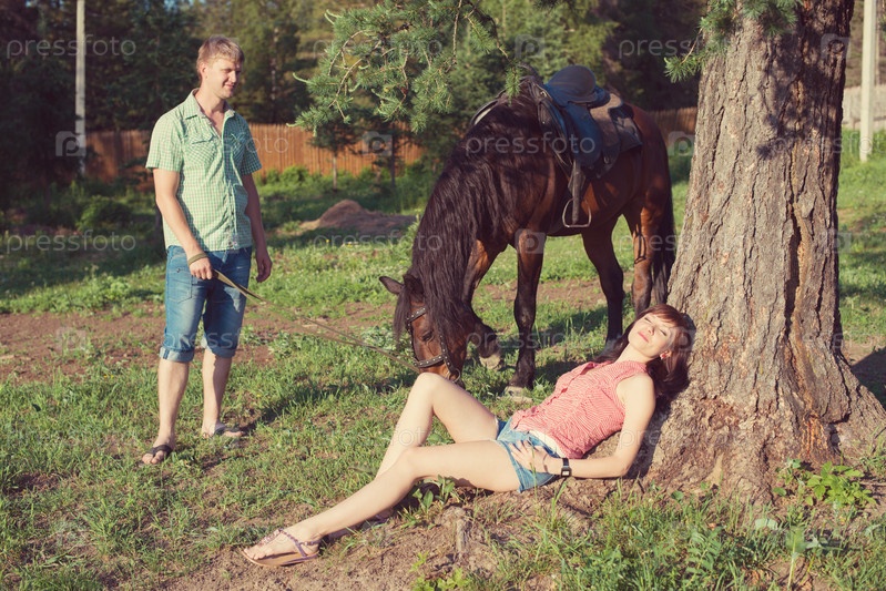 Молодая пара отдыхает в сельской местности летом