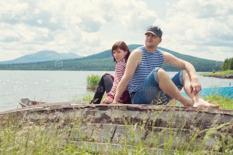Молодая пара отдыхает на берегу горного озера летом
