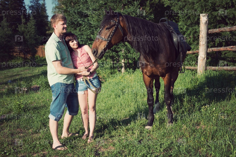 Молодая пара с породистой коричневой лошадью на природе