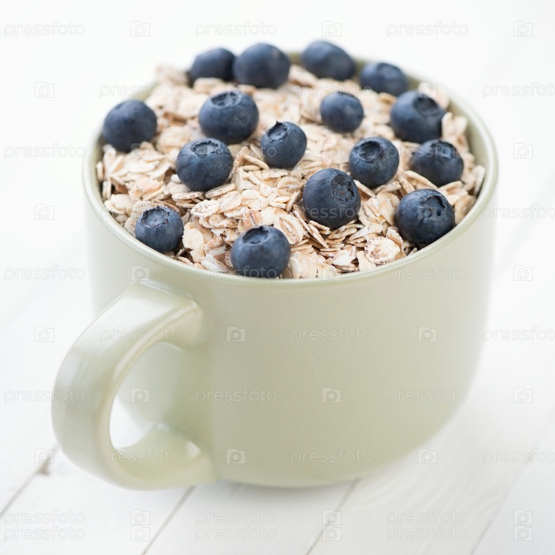 Чашка каши со свежими ягодами голубики, студия