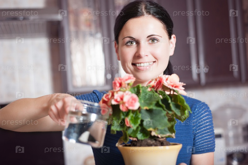 Женщина поливает цветы
