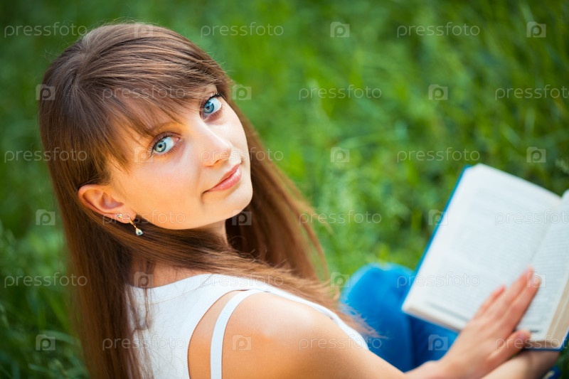 Красивая девушка с книгой в парке на зеленой траве