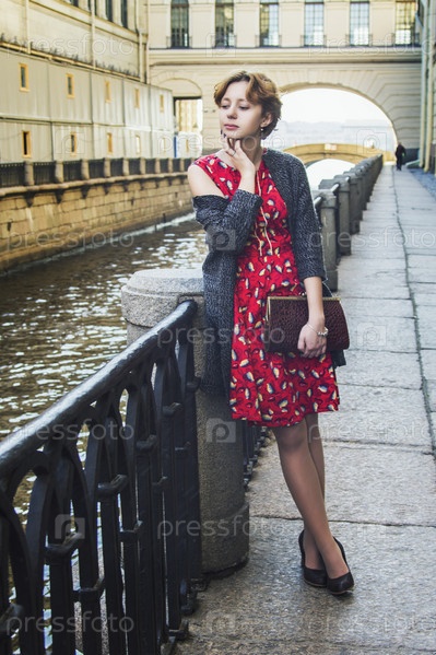 Девушка с короткими рыжими волосами в винтажном платье на мосту