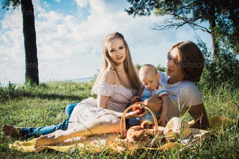Счастливая молодая семья отдыхает на природе летом