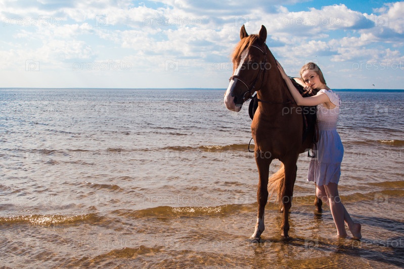 Девушка со светлыми волосами и конь на фоне залива