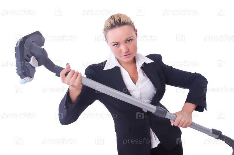 Бизнес-леди с пылесосом на белом