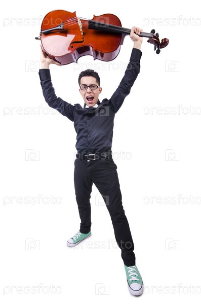 Забавный человек со скрипкой на белом