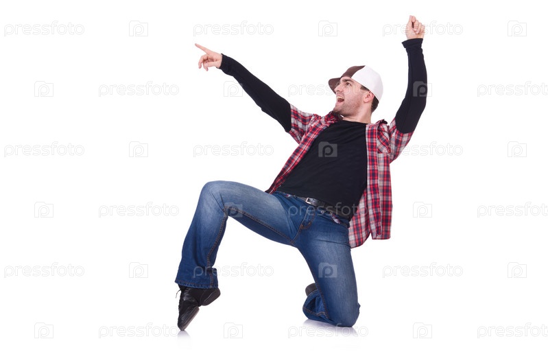 Мужчина исполняет современный танец на белом фоне