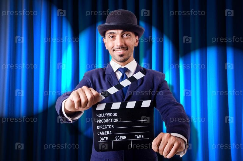 Человек с хлопушкой на фоне занавеса