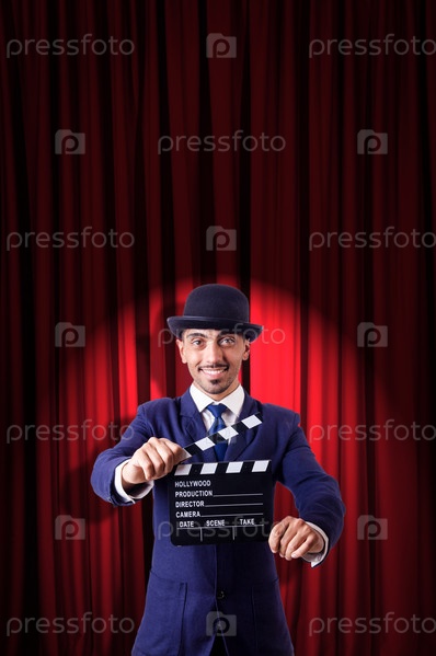 Мужчина с хлопушкой на фоне занавеса