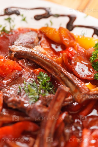 Приготовленные ена гриле ребра с овощами