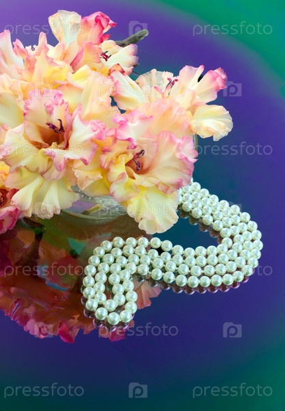 Гладиолус и бусы на зеркальном столе