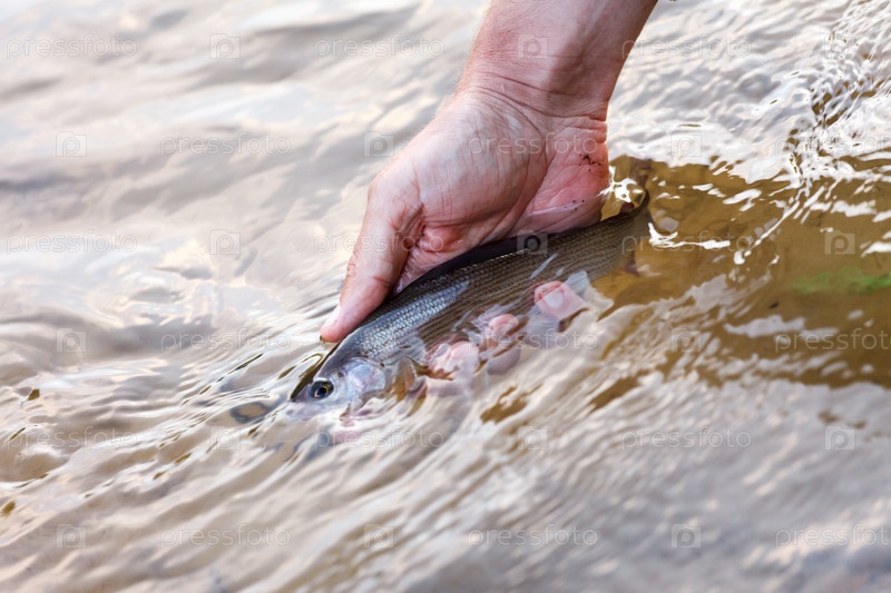 Рыбак держит хариуса
